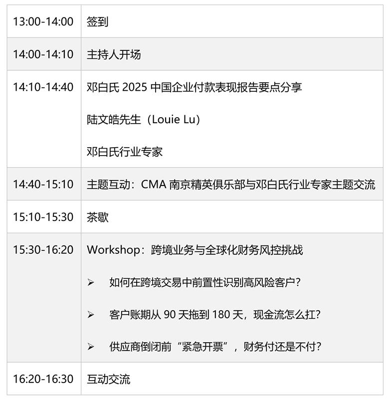 为进一步助力企业提升全球经营能力,增强财务与合规风险识别与应对能力,邓白氏携手CMA南京精英俱乐部,精心策划并联合举办主题为“跨境业务财务风控新思维:数据驱动与实战应对”的高端交流活动,诚邀各界企业财务管理者共同参与,共话跨境财务风控新路径。