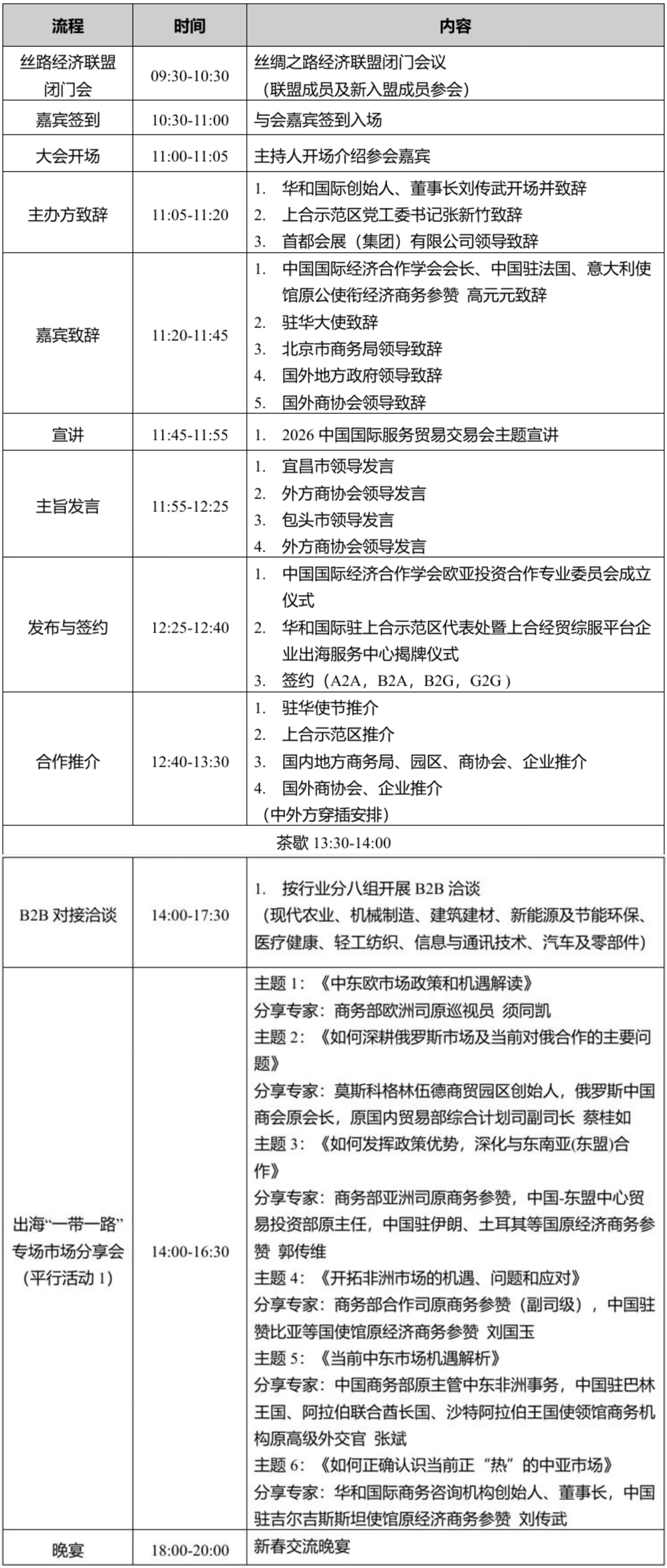 中国国际服务贸易交易会专题推介会暨2026“新年·新出海”国际投资贸易洽谈会将于1月26日于北京国家会议中心举行。本次活动以“新年·新出海”为主题,将邀请“一带一路”沿线国家建筑建材、新能源及节能环保、医疗健康、信息与通讯技术、交通及供应链等领域商协会负责人,携采购商及企业代表,以及驻华使节、各国地方政府代表等嘉宾参会,与国内企业、地方政府和商协会开展务实的、富有成效的推介对话以及B2B对接洽谈活动,旨在发挥国际商务专业和资源优势,持续搭建服务国内外企业、政府和商协会间“广泛交流合作方向,挖掘合作潜力和机遇,高效推进贸易投资合作”的务实平台。