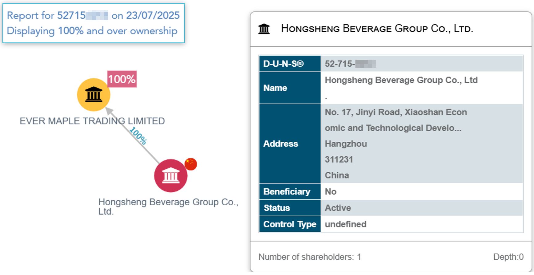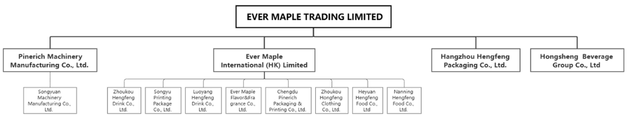 除娃哈哈集团外,宗氏家族企业众多,其中宏盛饮料集团由宗馥莉作为实控人。宏胜饮料集团的股权结构显示,其100%受控于恒枫贸易有限公司,该公司注册于英属维尔京群岛(BVI)。