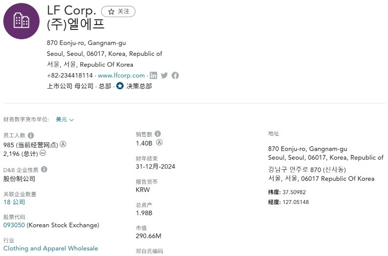 通过邓白氏全球商业数据库深入分析后推荐企业LF Corp.,它是一家韩国公司,主要从事设计、制造以及销售各种类型的服装,包括男装、女装及儿童服装,并且涉足时尚商品的多个方面,致力于提供高品质的产品和服务。该公司通过其多样化的品牌组合满足不同消费者的需求,不仅关注国内市场的需要,同时也着眼于国际市场的发展。有盛誉的品牌之一。