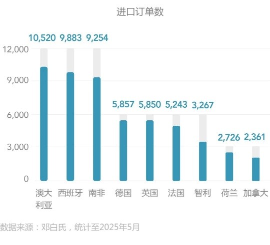 澳大利亚、西班牙和南非等国显示出较高的需求,而像加拿大和荷兰这样的国家虽然也有一定量的进口订单,但与前者相比显得较为温和。这种差异不仅反映了各国经济状况的不同,也揭示了各地消费习惯和文化背景的多样性。