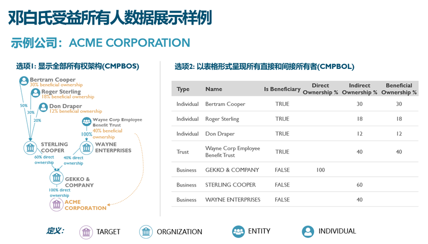 邓白氏拥有覆盖全球 200 多个国家和地区、超过 6 亿家企业的庞大数据库。依托全球企业股东数据的层层关联,能够实现全球股权穿透,为企业提供一站式最终受益人(UBO)识别解决方案。通过对全球企业间持股关系进行点对点关联,形成精准的股权穿透图谱,助力企业在全球范围内快速定位最终受益人和关联结构。基于 D-U-N-S® 统一编码体系,邓白氏能穿透境内外多层法人架构,清晰识别控制路径,并依据持股比例、控制关系、投票权等多维规则自动判断 UBO。