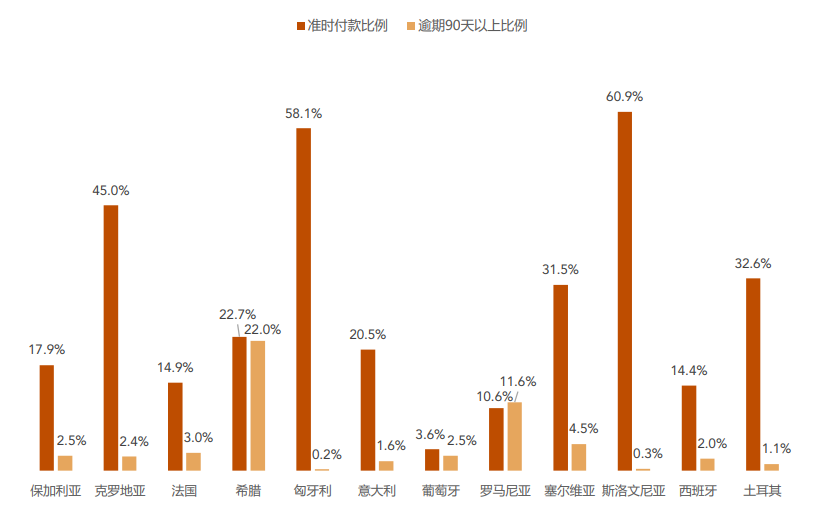 大型企业经营状况整体较为稳定,因此大部分国家和地区的大型企业中,逾期90天以上的企业比例都低于中小微型企业,但希腊、罗马尼亚的大型企业逾期90天以上的比例分别达到22%和11.6%,容易对上游的采购方造成较为严重的资金压力。