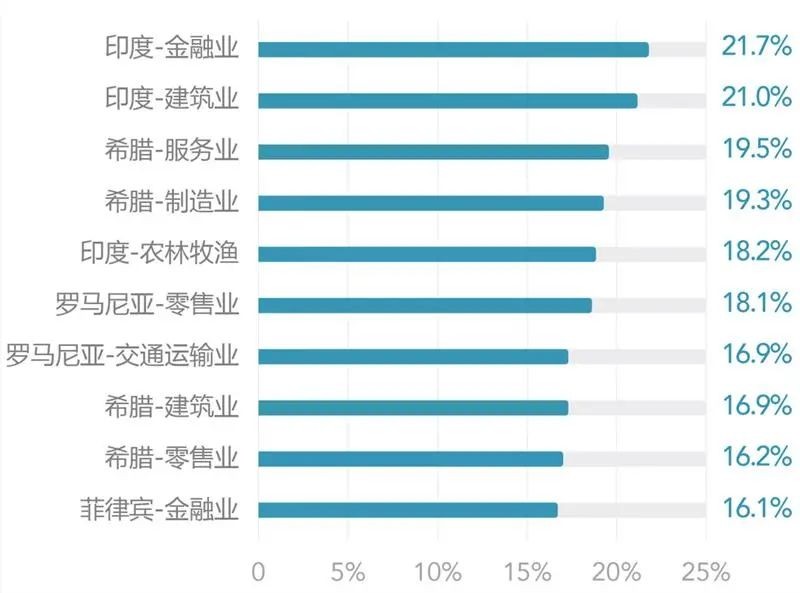 全球各市场中逾期90天以上企业占比最高的10大行业