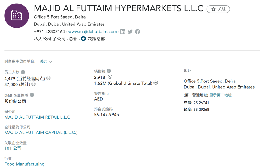 通过邓白氏全球商业数据库深入分析后推荐企业MAJID AL FUTTAIM HYPERMARKETS L.L.C,该集团由Majid Al Futtaim于1992年创立,现已成长为中东最大的生活方式和休闲集团之一,在中东、非洲和中亚拥有并经营着4个多功能社区、13家酒店、29家购物中心以及450家线下零售门店,在30个国家拥有家乐福品牌的特许经营权,并在16个国家运营该品牌。