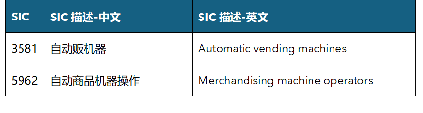 本文对行业的划分主要依据是US SIC 1987。SIC Code是标准产业分类代码(Standard Industrial Classification),为了确定商业机构主营业务,方便收集,描述和分析数据而建立。SIC CODE由4位数字组成,本文中出现的自动贩卖机从业企业选取了如下SIC: