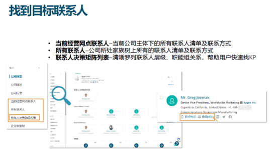 在与客户开展业务的过程中,准确找到能够对采购决策产生关键影响的人物,提高沟通效率和业务成功率。HOOVERS 在法律许可的范围内提供企业关键业务联系人的职位等信息。有针对性地与这些关键人物进行沟通和交流,展示企业的产品优势和解决方案,了解他们的需求和关注点,从而更有效地推动业务合作的达成。