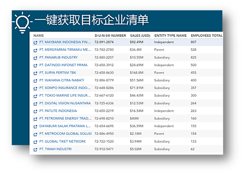 基于贴标签的结果以及进一步的筛选条件,建立详细的目标客户、潜在市场机会等清单,为后续的营销和业务拓展提供明确的对象和方向。同时,清单会随着邓白氏的数据更新而保持新鲜,确保信息的时效性。